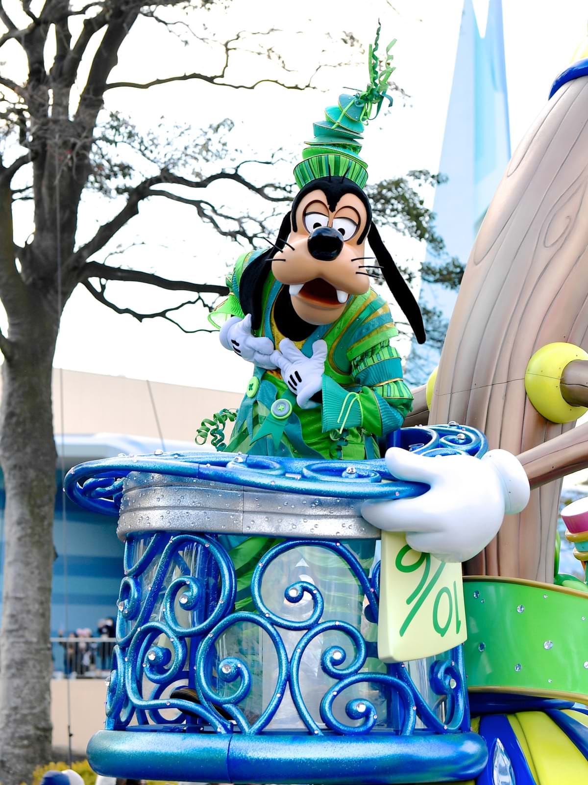 グーフィーは、アリスのにぎやかなお茶会やピノキオのおもちゃの世界のフロートを先導。