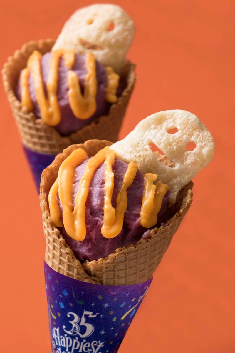 可愛らしい顔をのぞかせているゴーストたちが、牛カルビコーンを紫色とオレンジ色のハロウィーン仕様に仕立てました。