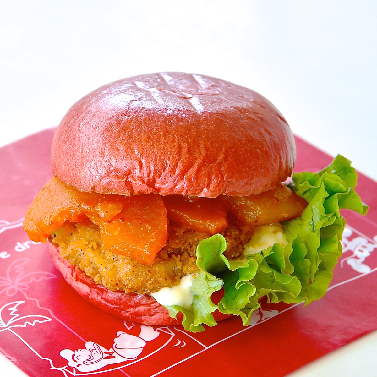 ペッパーフライドチキン&アップルサンドは、りんご飴のように真っ赤なサンドです。