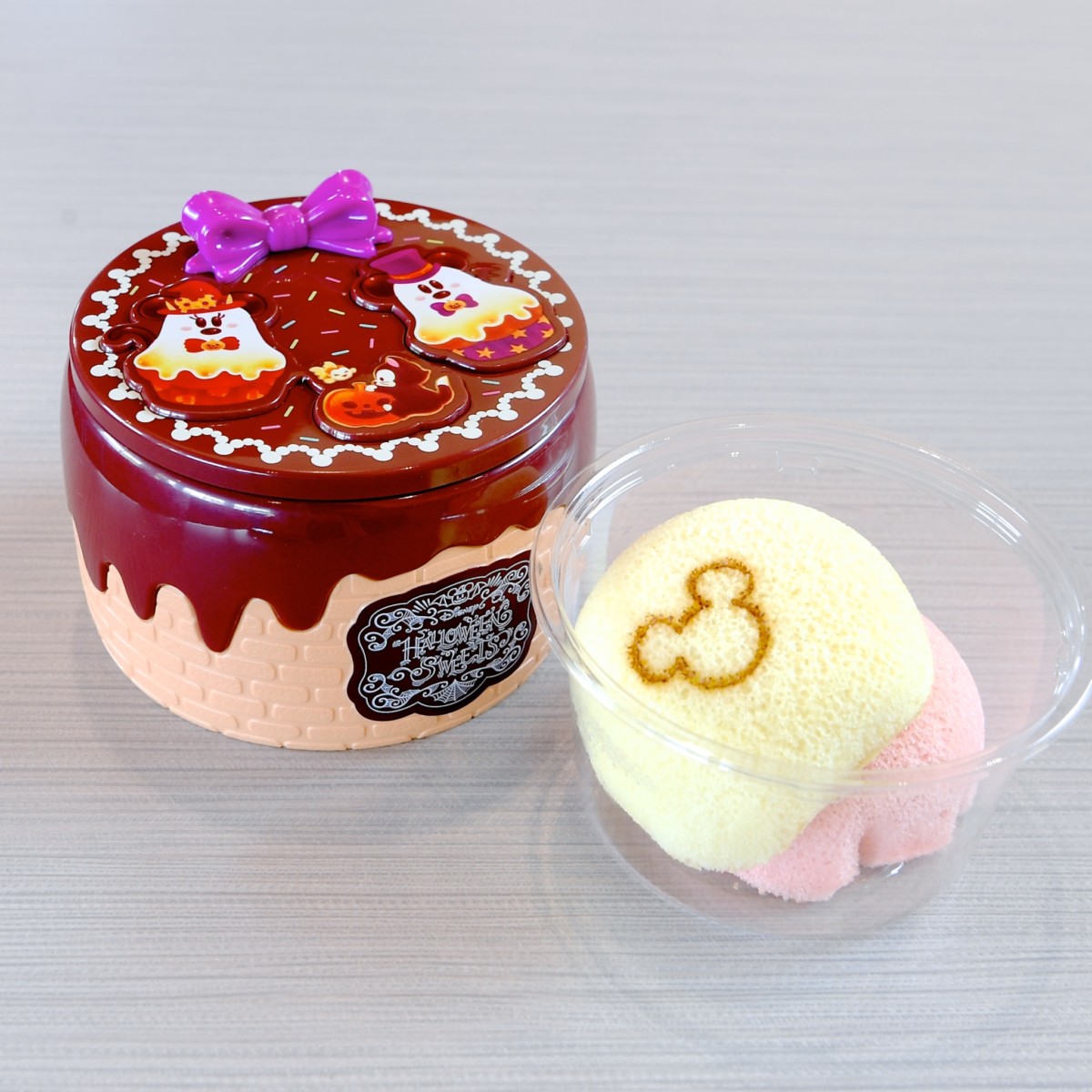 蓋の部分にはカップケーキのおばけのようなミッキーとミニーがデザインされています。