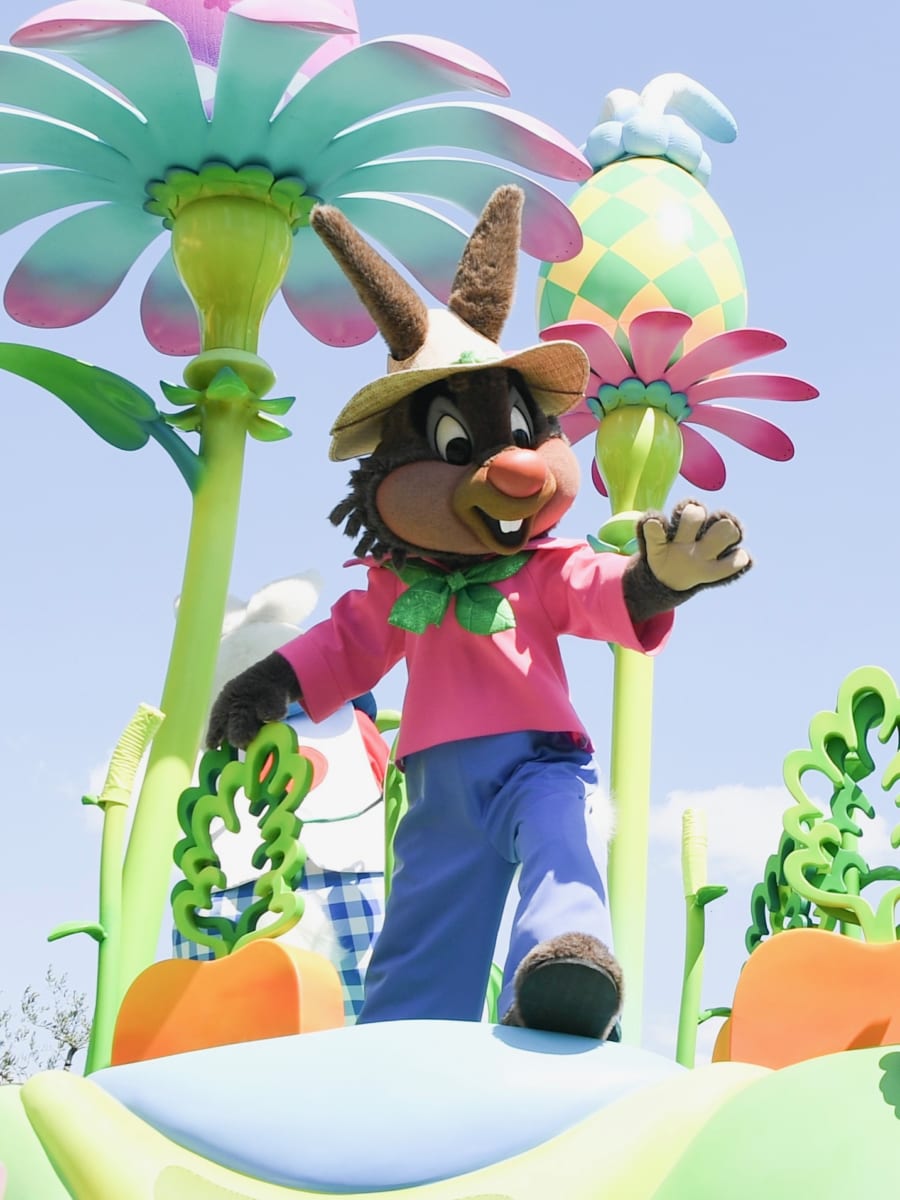 7台のフロートを中心に大小さまざまなカートが連なるパレードは、途中で停止してゲストと一緒に“うさたま”を探して捕まえたり、また逃げられたりを繰り返しながら、にぎやかでヘンテコ楽しいイースターを繰り広げます☆