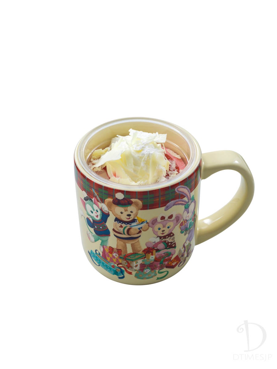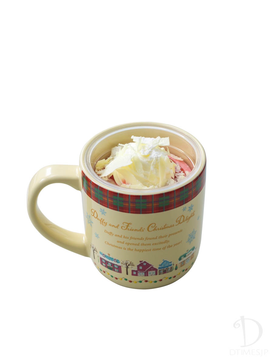 クリスマスプレゼントを楽しそうにあけるダッフィー、シェリーメイ、ジェラトーニ、ステラ・ルーを描いたスーベニアカップ付き。