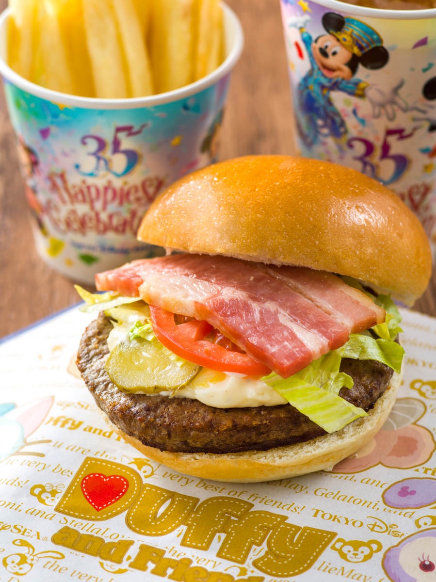 ビーフパティ、細切りレタス、トマト、ベーコン、ピクルスを、タルタルソースとともにサンド。