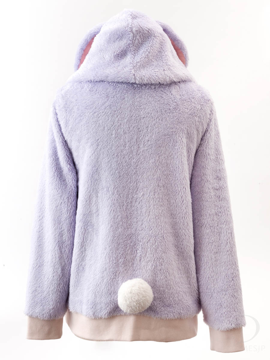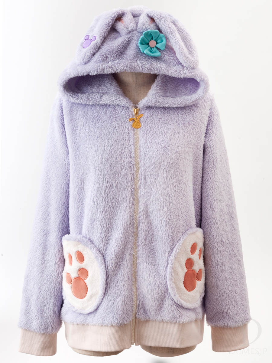 女の子らしいラベンダー色に、フードには裏面にミッキーモチーフがあしらわれた長い耳やブルーのお花付き!