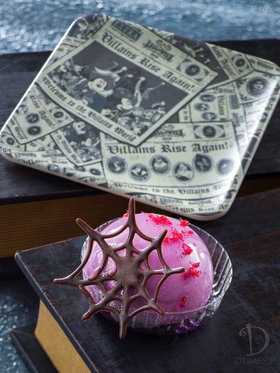 紫イモのムースには、クモの巣形チョコとラズベリーをトッピング。