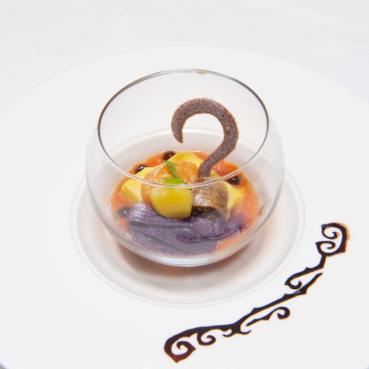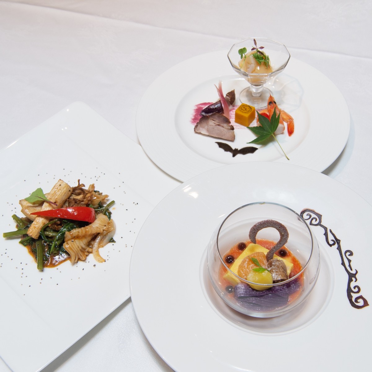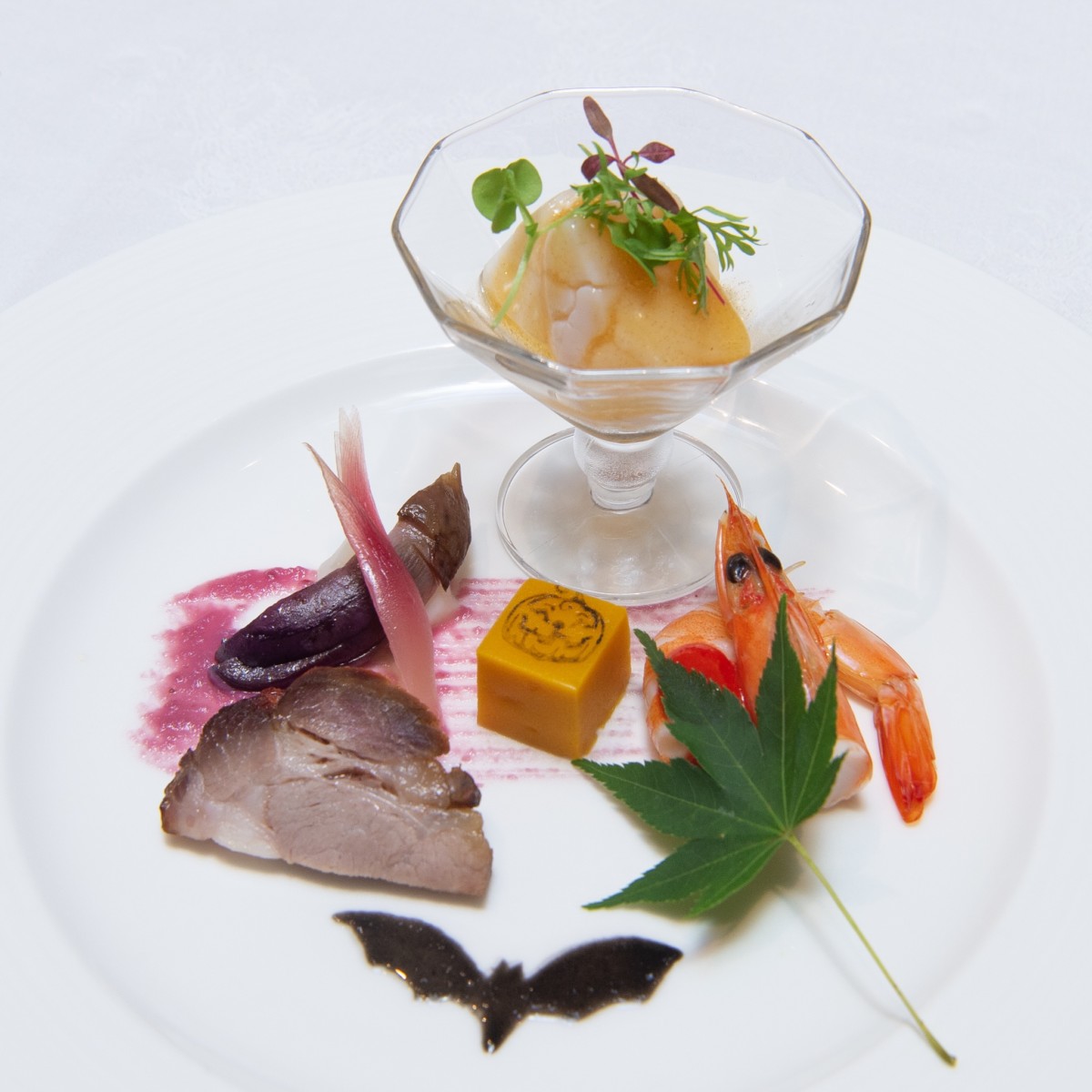 ライチソースをベースにしたクコの実のソースに、カボチャ味の杏仁豆腐と紫いものモンブランをのせ、アンズ、栗、イチジクのコンポートとブラックタピオカで飾られた、色合いもハロウィーン気分満載のデザートです。