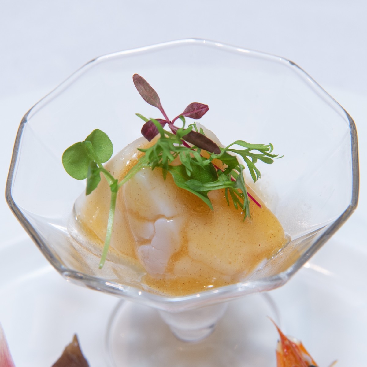 グラスに入ったホタテとかぶは、旬の柿を使った甘酢ソースがかけられており、柿のやさしい甘さが新鮮な食材とよく合います。