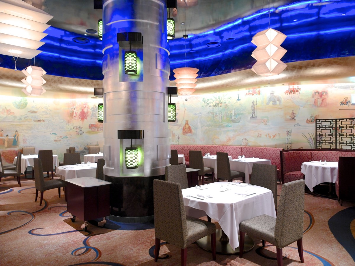 ライトに照らされたブルーの天井が幻想的な店内で本格的広東料理がいただける中華料理レストラン「シルクロードガーデン」