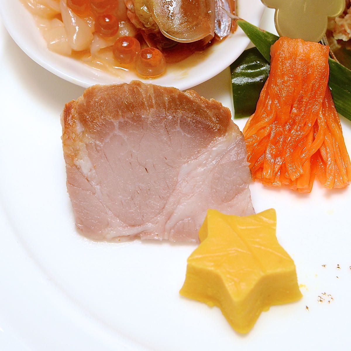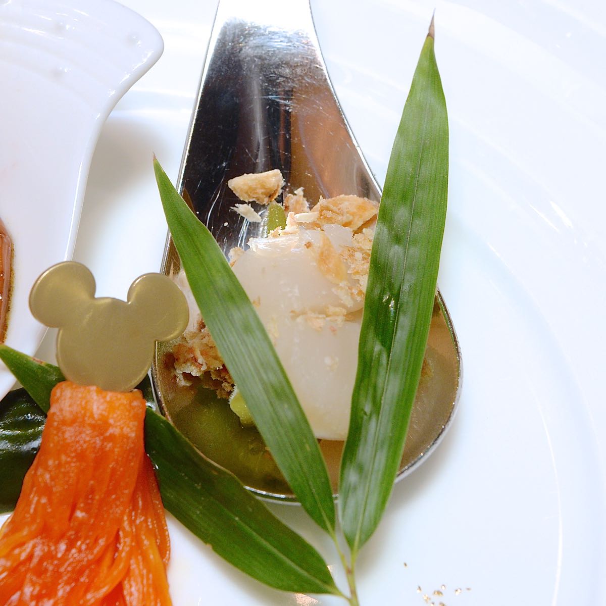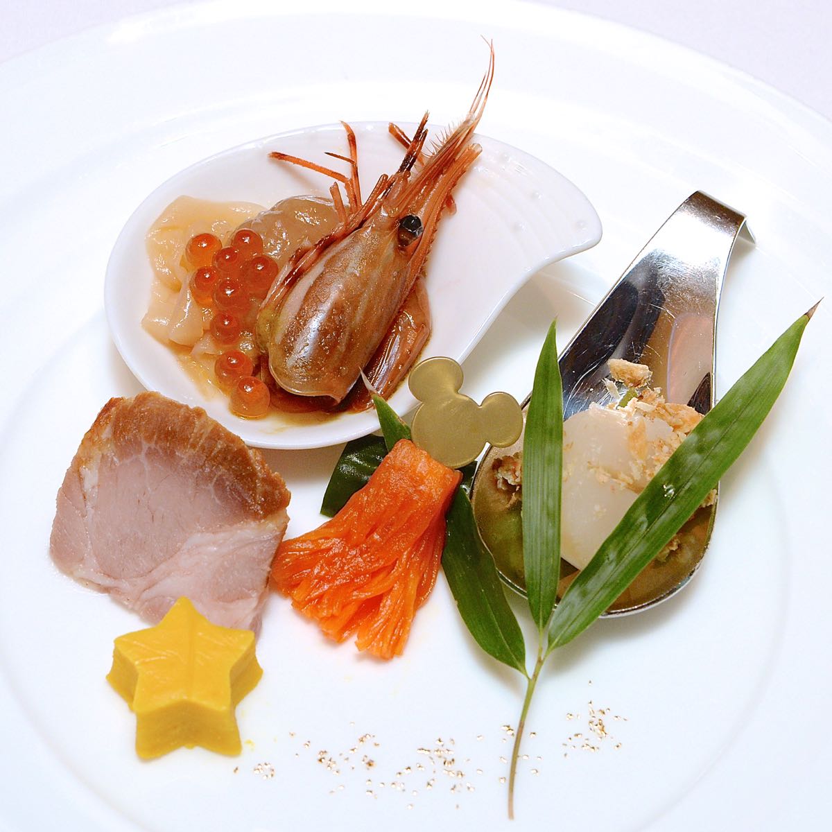 中央にはミッキーの吹き流しのようにアレンジされた、大根の甘酢が添えられています。