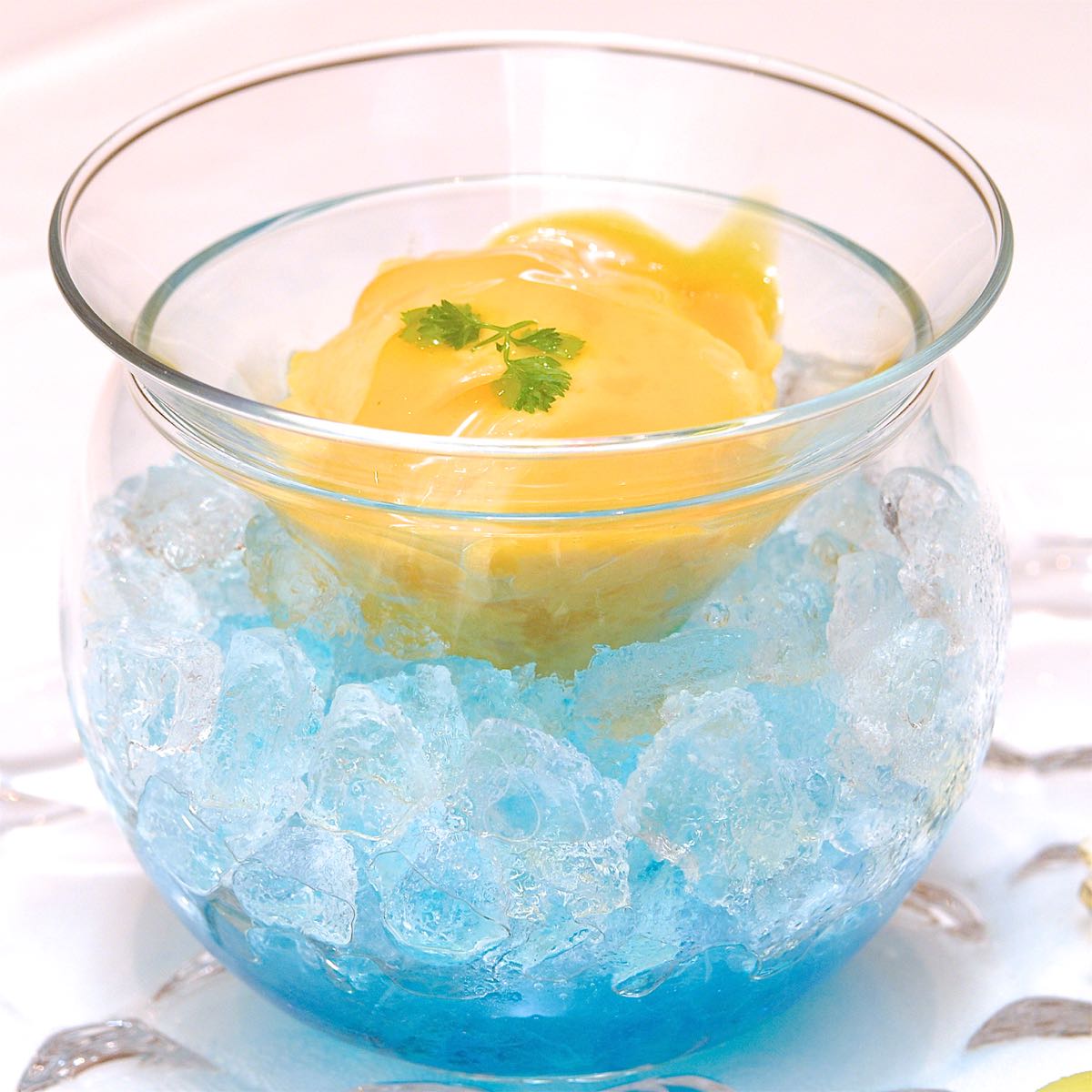 果肉が入った濃厚なマンゴープリンと杏仁豆腐、コロンと丸くくりぬかれたメロンとマンゴー、星の形がかわいいゼリーが盛りつけられています。