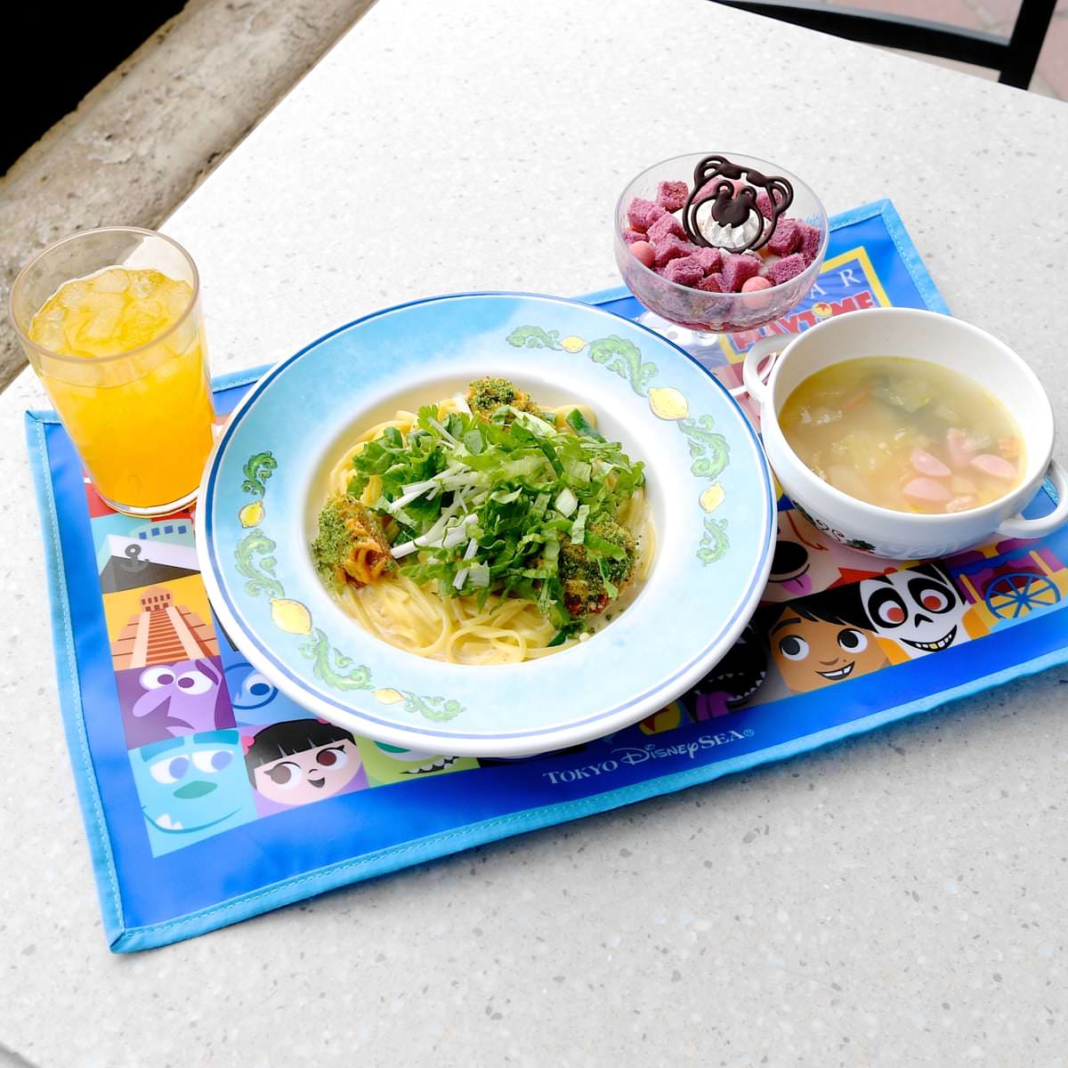パスタ、スープ、ドリンクのほか、3種類のデザートから好きな1品をチョイスできる「トイ・ストーリーセット」と、「バズ・ライトイヤー」をモチーフにした「グリーンアップルソーダ」を紹介します☆