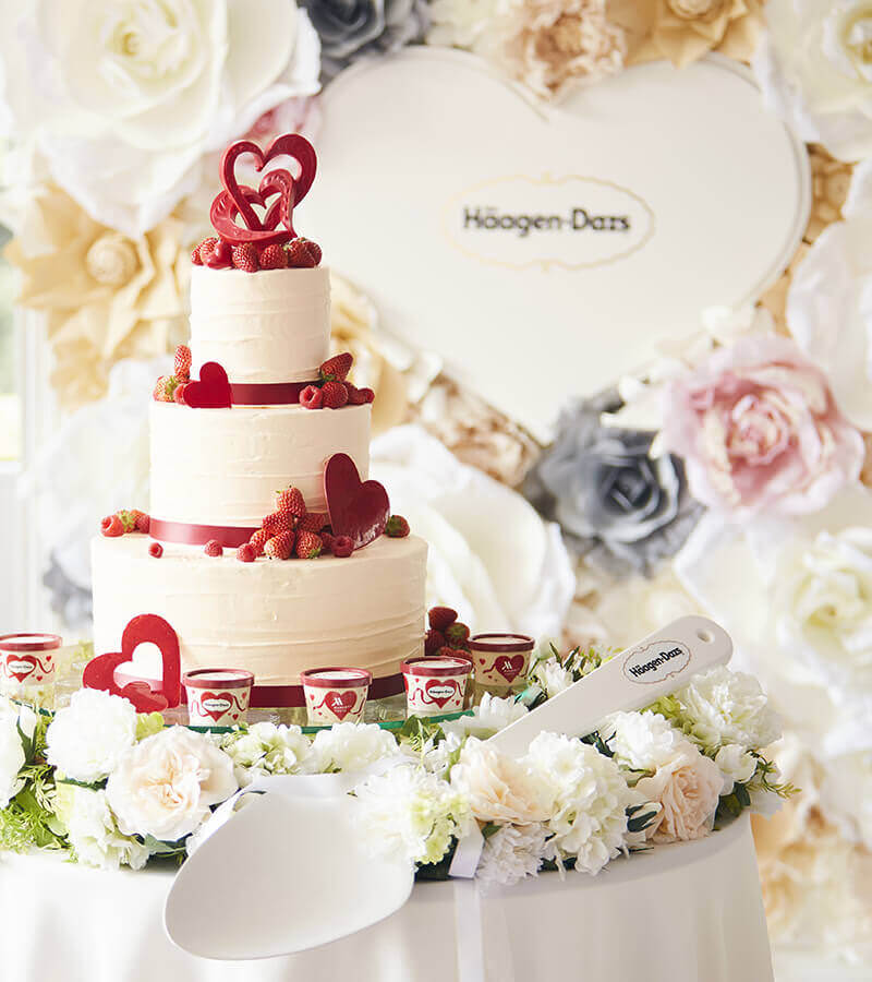 ハートをモチーフにハーゲンダッツの世界観を表現した、東京マリオットホテルのパティシエが創り上げるウエディングケーキとゲストへのおもてなしデザートのセットプラン。