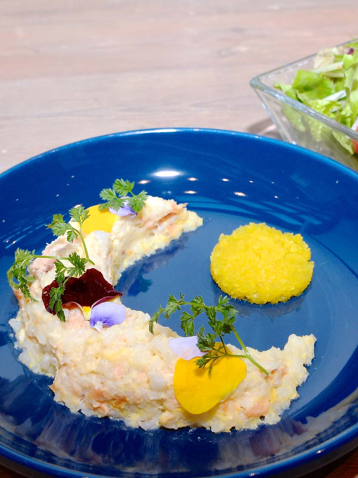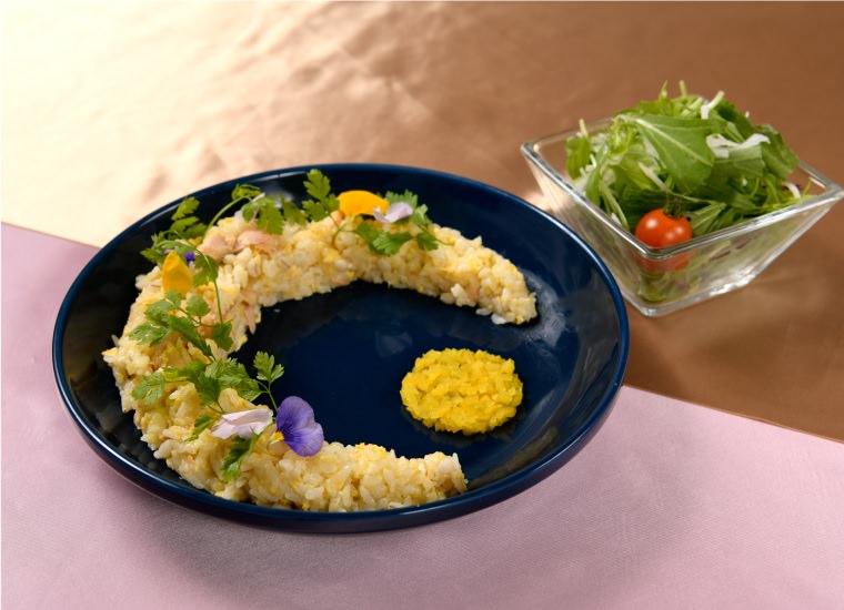 ご飯の上の鮮やかなエディブルフラワーが、上品な雰囲気を演出します。