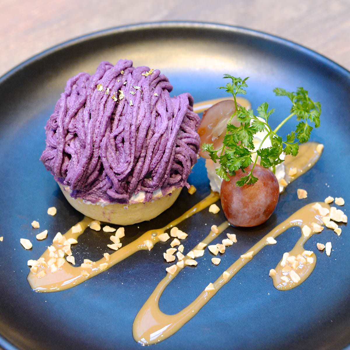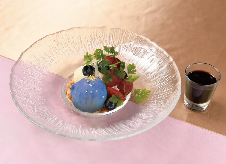 ブルーのシロップが添えられていて、注ぐと色合いの変化が楽しめます。
