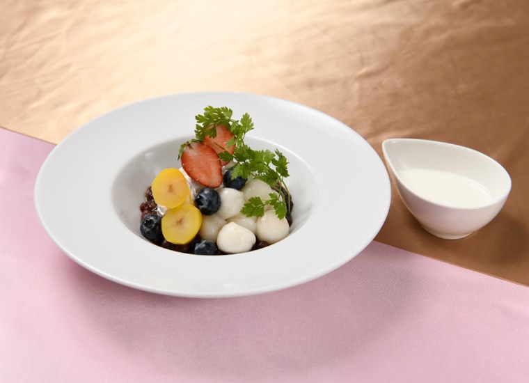 別添えの温かい牛乳を注ぎ、小豆、白玉、バニラアイスとともにいただきます。