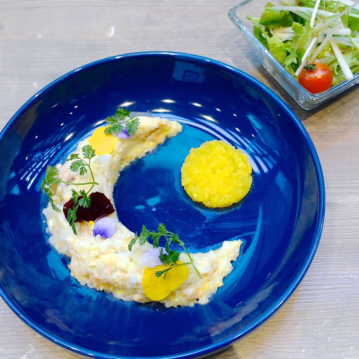 三日月宗近をイメージした和風出汁で炊いた鮭の雑炊風ご飯です。