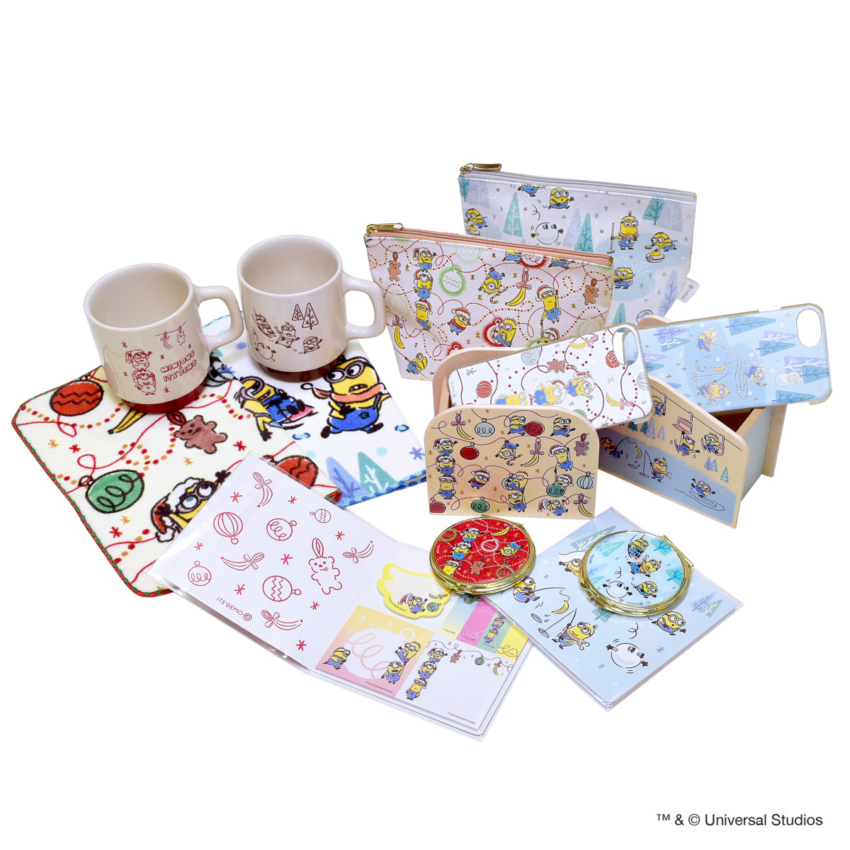 雪山の中ではしゃぐいたずら好きなミニオンや、クリスマスパーティーの準備をするミニオンが描かれたグッズはどれもかわいい☆