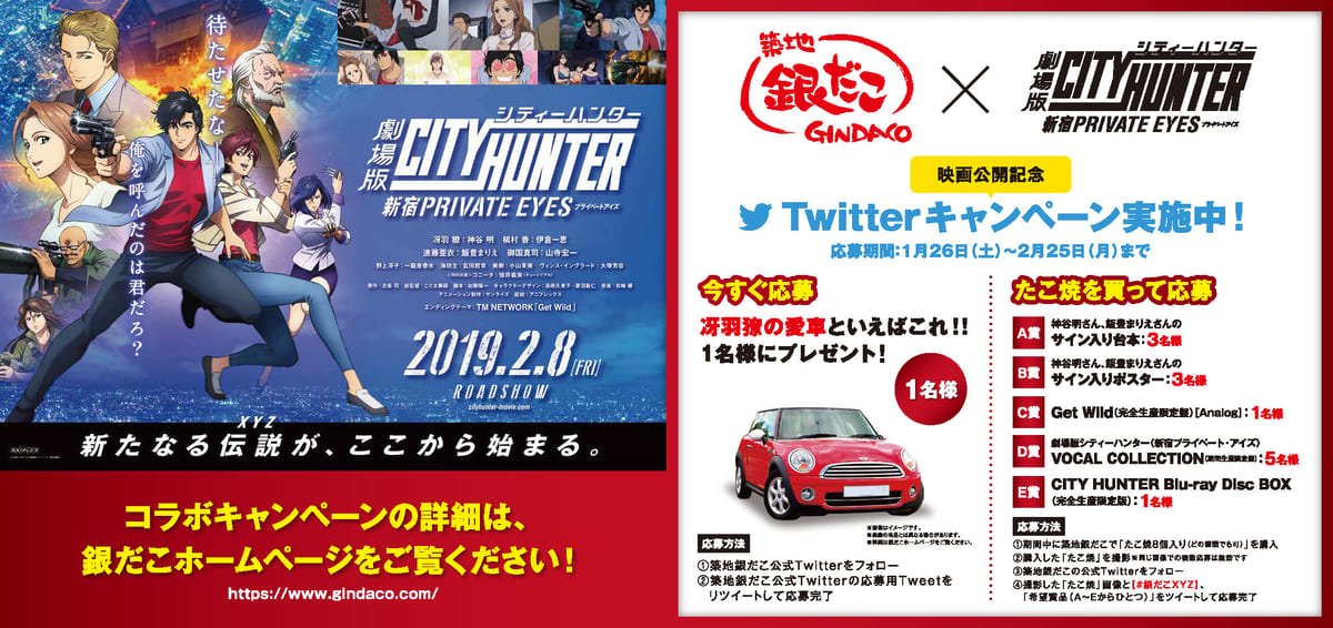 さまざまなトッピングたこ焼きが人気の「築地銀だこ」が、2019年2月8日(金)より公開の映画「劇場版シティーハンター<新宿プライベート・アイズ>」とのコラボレーションキャンペーンを、2019年1月26日(土)から開催!
