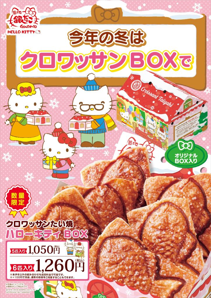 築地銀だこに、2018年12月1日(土)より、ハローキティとのコラボ商品「ハローキティ クリスマスだんらんパック」と「クロワッサンたい焼 ハローキティBOX」が限定店舗にて数量限定で登場!