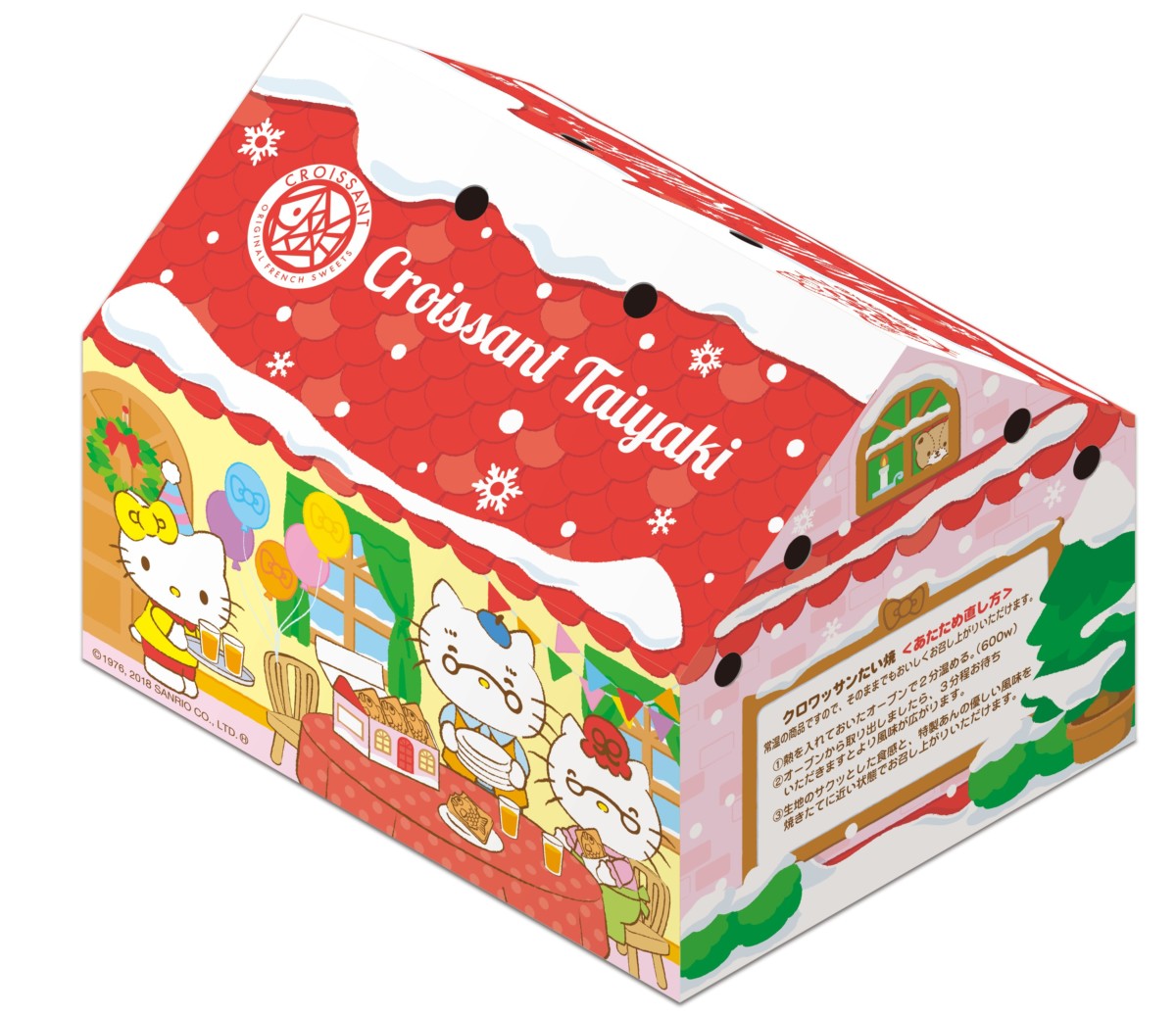 ボックスの側面にはサンタクロースのような赤い帽子をかぶったハローキティとたこ焼き、ミミィたちがデザインされています。