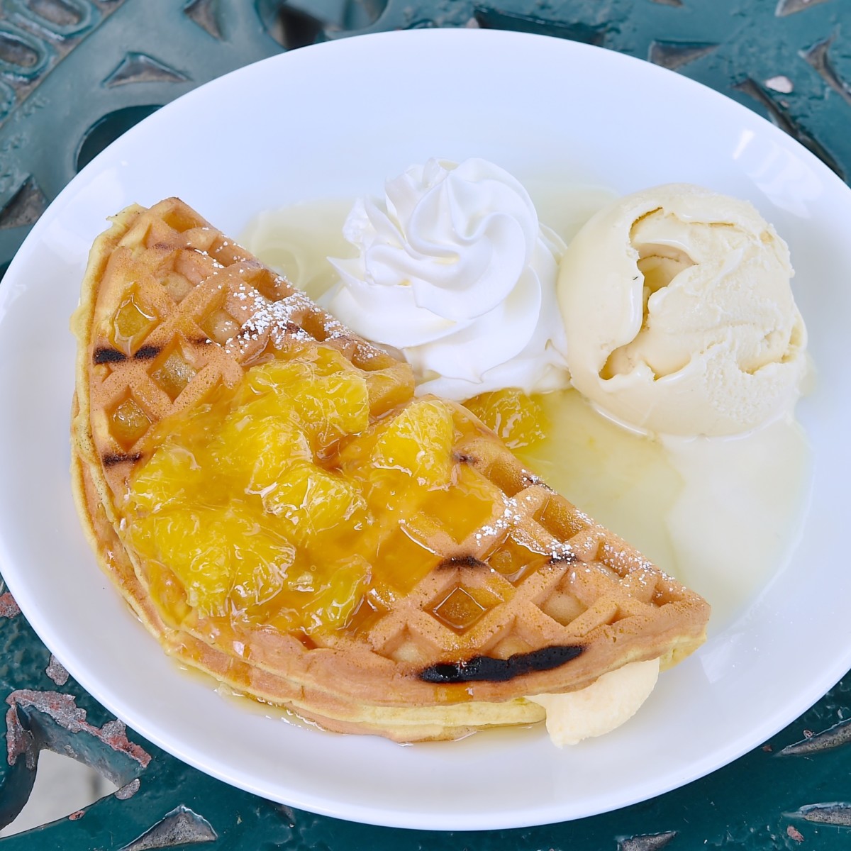 カスタードムースをはさんだワッフルに、オレンジソースとはちみつをトッピング。