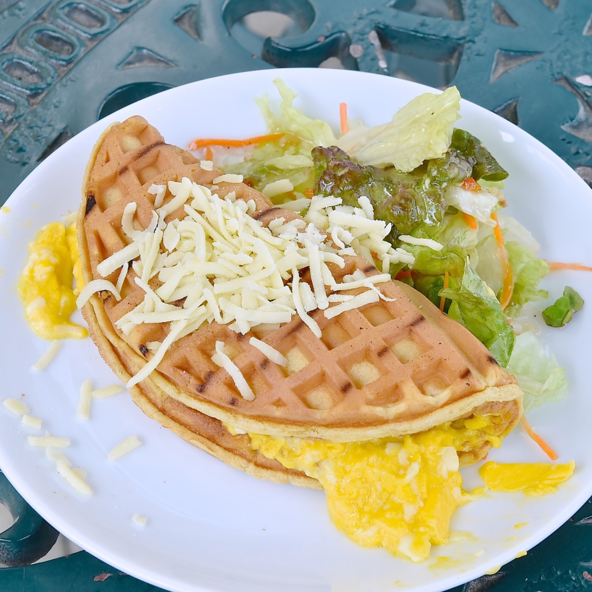 ふんわりとしたワッフルにスクランブルエッグをサンドし、サラダを添えたお食事系ワッフル。