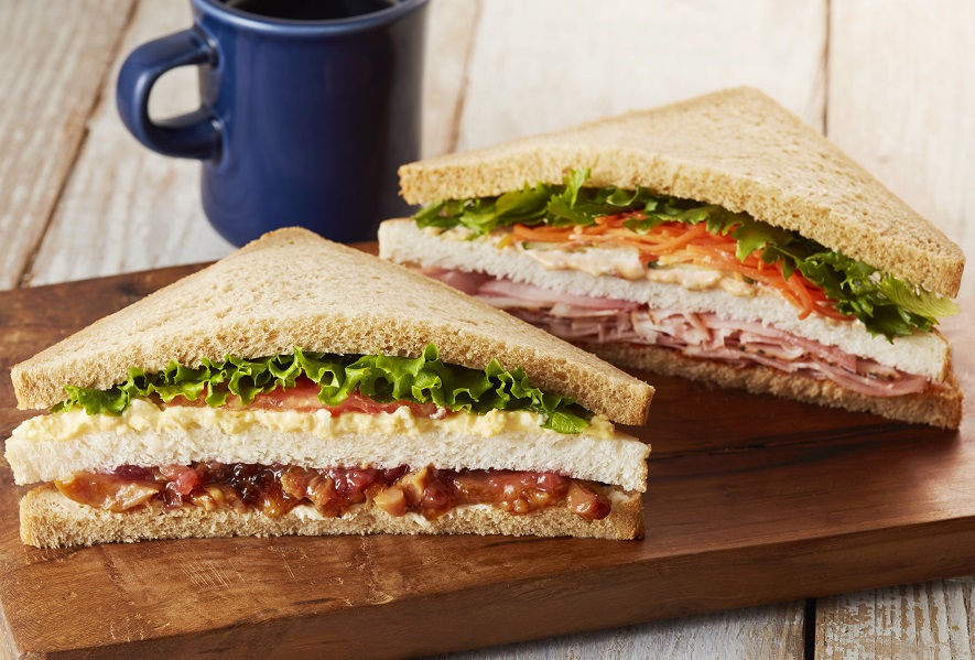ランチにもぴったりな「ベーコン&トマトタルタルサンド」と、「テリヤキチキンエッグサンド」の2種類のサンドイッチも販売中です。