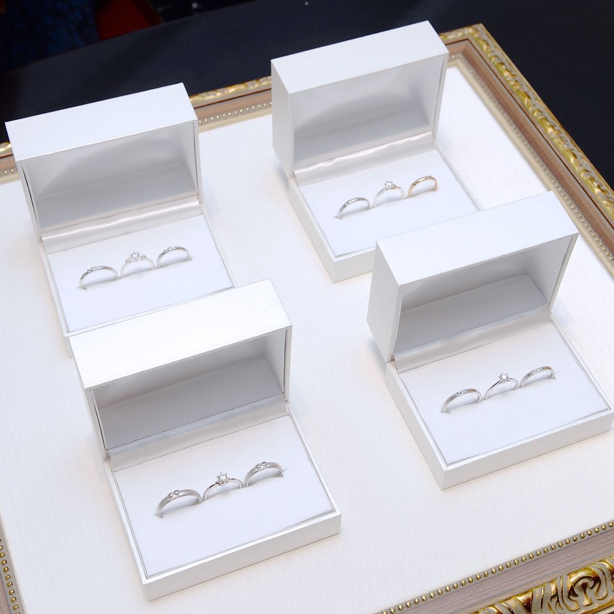レリーフ状の程よい立体感がシンプルでプレーンなリングとマッチして思わず触れていたくなるくらい、ふたりの可愛らしさを際立たせています。