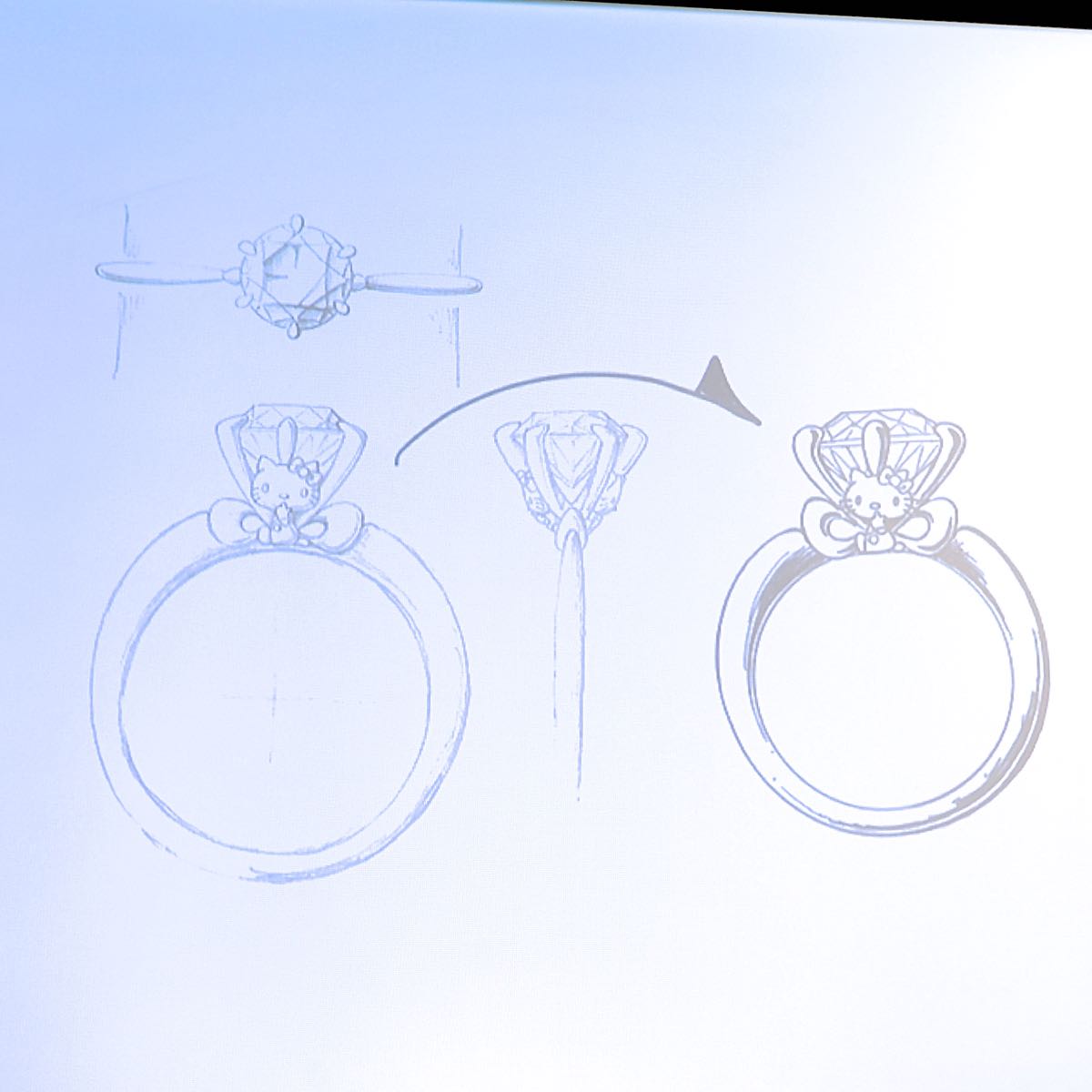 中心に描かれているのは、ユートレジャーで実際に販売されている、ハローキティのデザインのエンゲージリング。