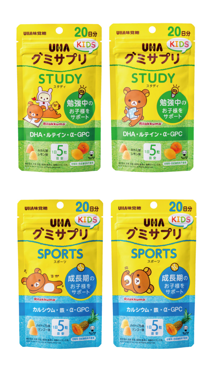 リラックマパッケージがかわいい、UHA味覚糖「UHAグミサプリKIDS SPORTS/UHAグミサプリKIDS STUDY」は、全国のドラッグストアなどで好評発売中です。
