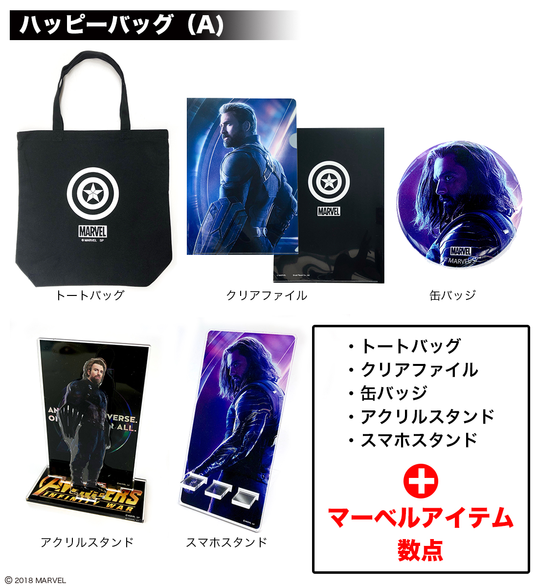 内容:トートバッグ、クリアファイル、缶バッジ、アクリルスタンド、スマホスタンド、マーベルアイテム数点