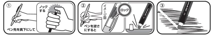 また字を消すための消し具は、筆記時は一般的なノック式ボールペンと同様に、ペン先を下に向けるとスムースにノックすることができ、字を消す時には軸を逆さにするだけで内蔵されている「ロック機構」が作動して、消し具を固定するのでしっかりと消すことができるという優秀さ。