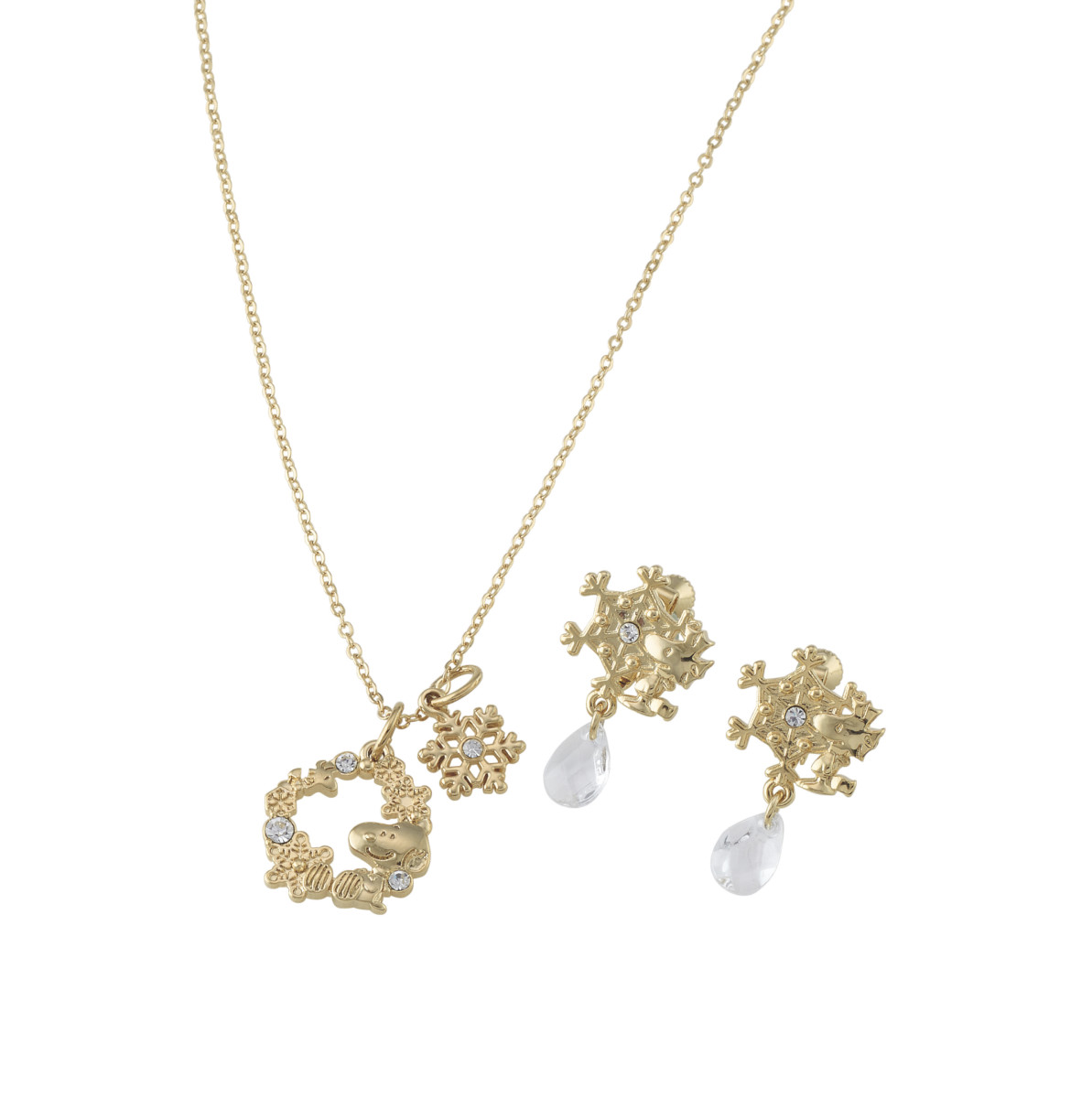 スヌーピーのネックレスとウッドストックのイヤリングのセット。