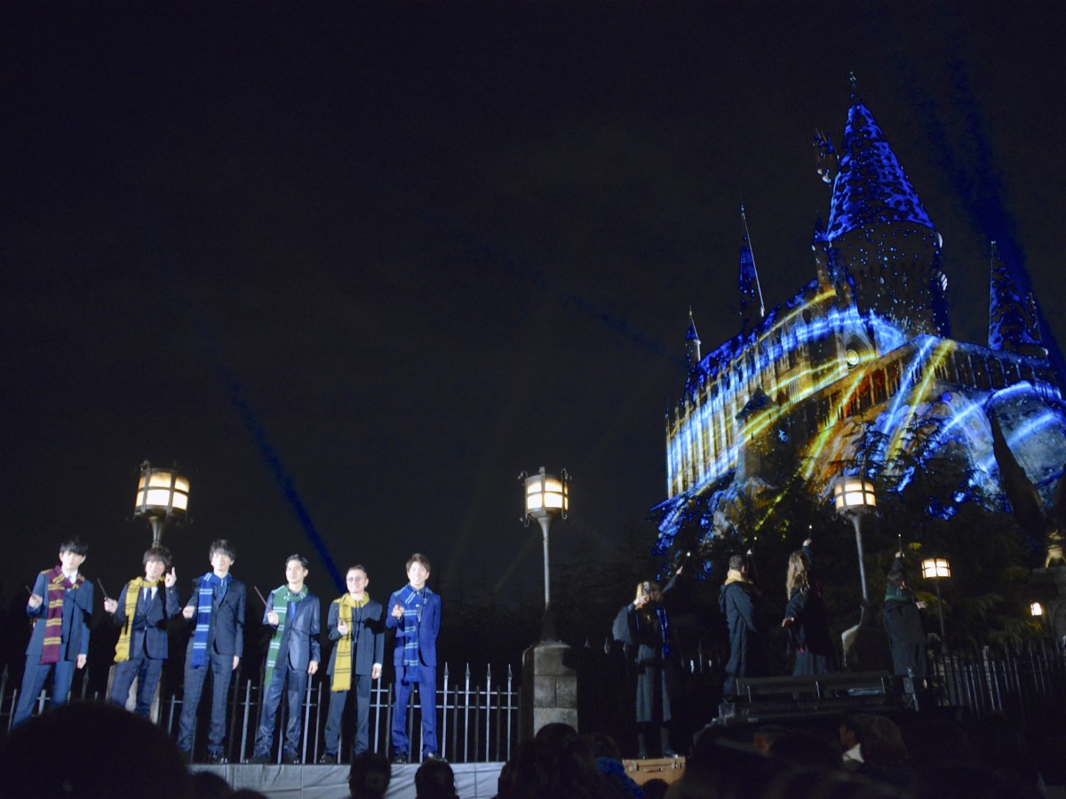 雪化粧の魔法界で繰り広げられるエンターテイメントでは、ホグワーツ魔法魔術学校の生徒による魔法でホグワーツ城が次から次へと美しいシーンへと姿を変えると、特別に招待されたハリー・ポッターファンも大満足。