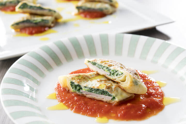 ランチタイムは、ハムとほうれん草とチーズをクレープで巻いた「クレスペッレ」がラインナップ。