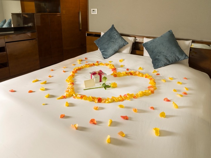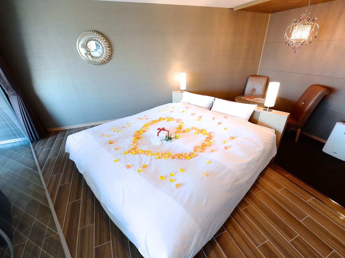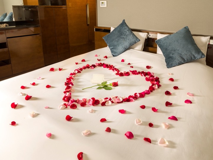 ベッドの上に生バラをハート型にデコレーションする、恋人との記念日のサプライズにぴったりのオプション。