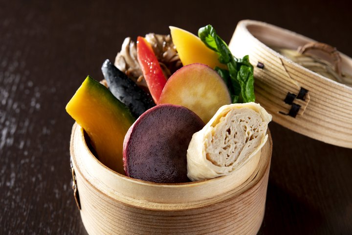 野菜の彩りが美しい、平日限定の特別メニュー「湯葉・芋・南瓜・舞茸のミニセイロ蒸し」