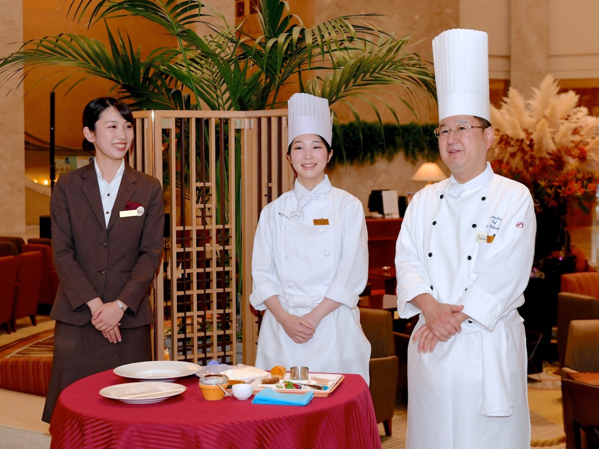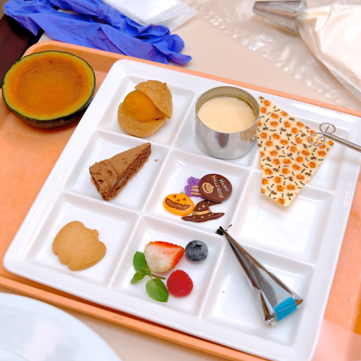 今回の体験プログラムは、シェフとおそろいのコック帽をかぶり、ホテルのシェフやスタッフと一緒にハロウィーンスイーツ「ハロウィーン☆プリンアラモード」をデコレーション!