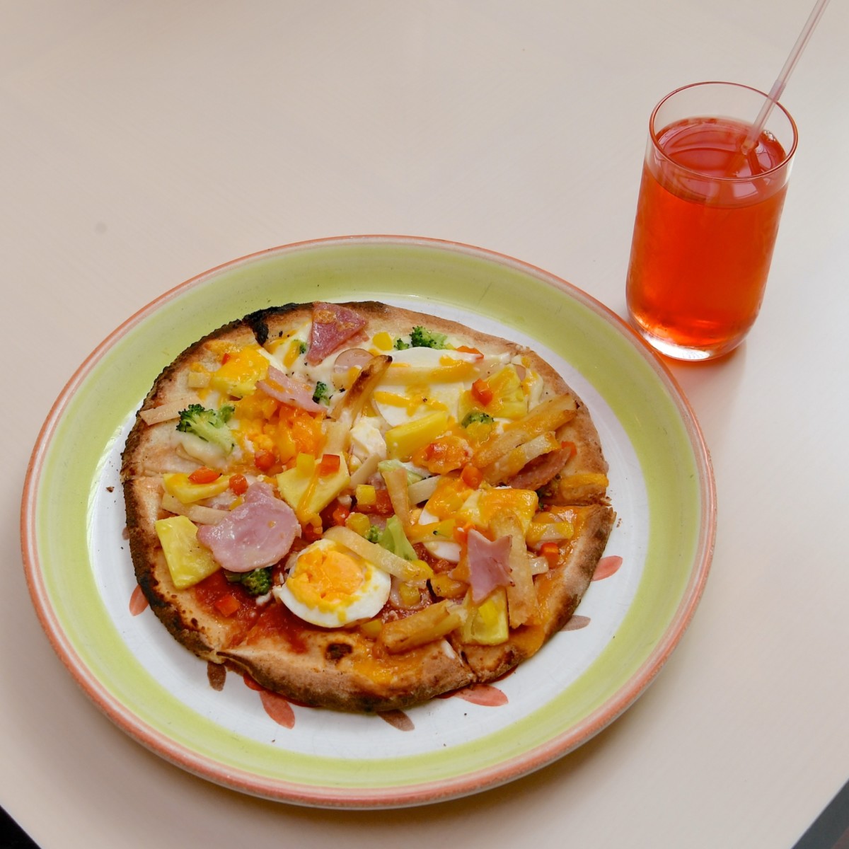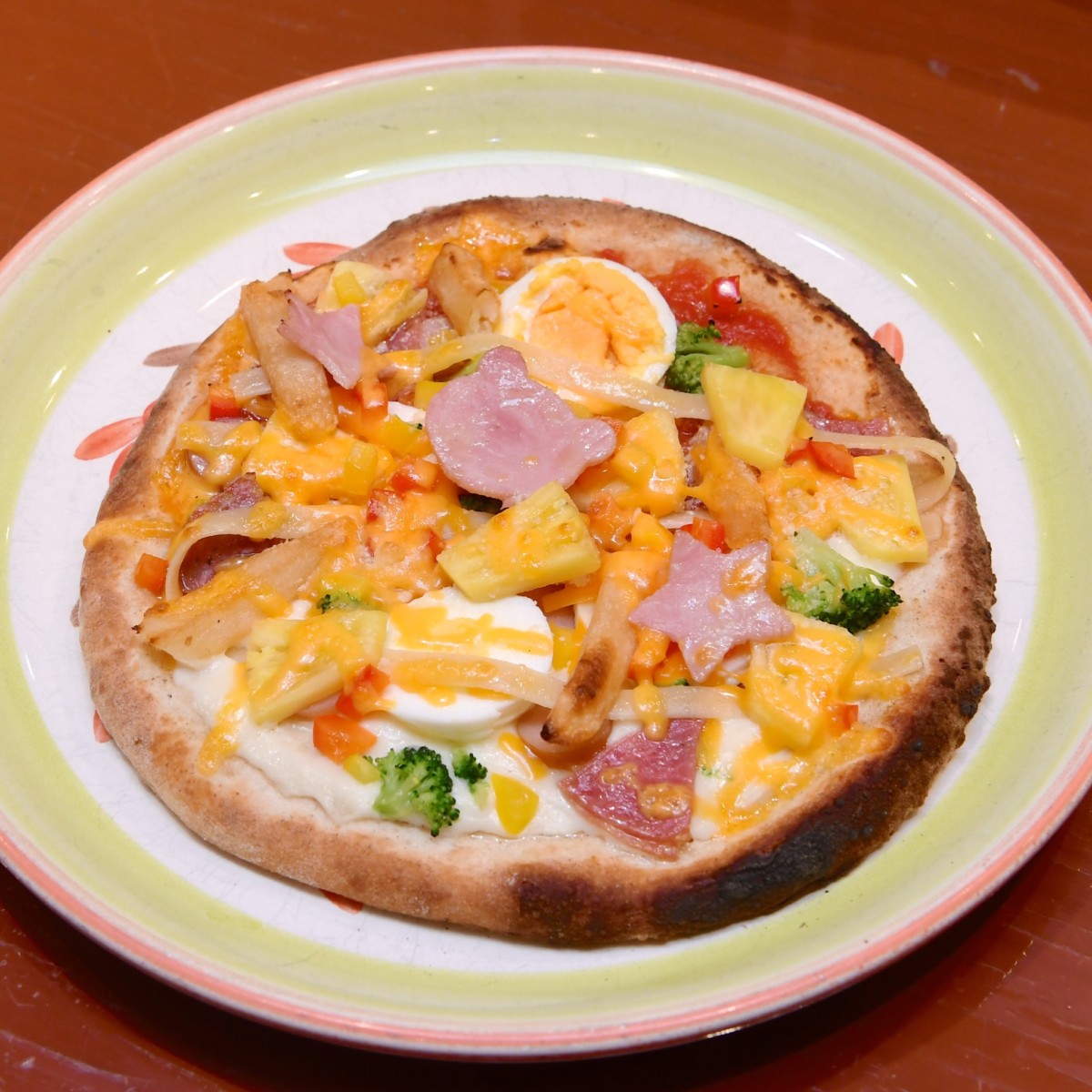 続いて、ハム、パイナップル、ソーセージ、サラミ、パスタ、ゆでたまご、パプリカ、ポテト、ブロッコリーと彩り豊かなトッピングを生地にのせていきます。