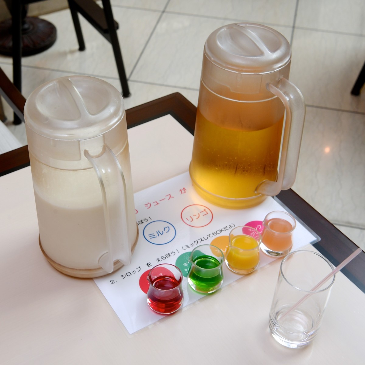 ミルク、アップルジュースをベースに、イチゴシロップ、キウイシロップ、オレンジシロップ、ピンクグレープフルーツシロップを組み合わせ、カラフルなドリンク作りを体験できます。
