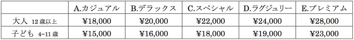 商品価格:食事等の内容により5タイプ(カジュアル、デラックス、スペシャル、ラグジュアリー、プレミアム)を用意。