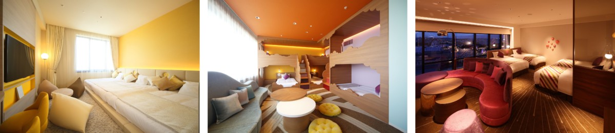 総客室数は428室で、カップルやファミリー、団体のゲストまで、ゲストの利用シーンに合わせ、パークを見渡すことができる約70㎡(6名定員)の開放的な角部屋タイプや、すべて絨毯敷きの靴を脱いで素足でくつろぐことができるタイプ、メゾネットタイプ、そして2段ベッドタイプなど、全14タイプのバラエティに富んだ客室が用意されています。