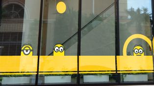 エントランス横のウインドーに描かれたグラフィックの「ミニオン」たちは外から見るとひょっこり顔をのぞかせているように見えます。