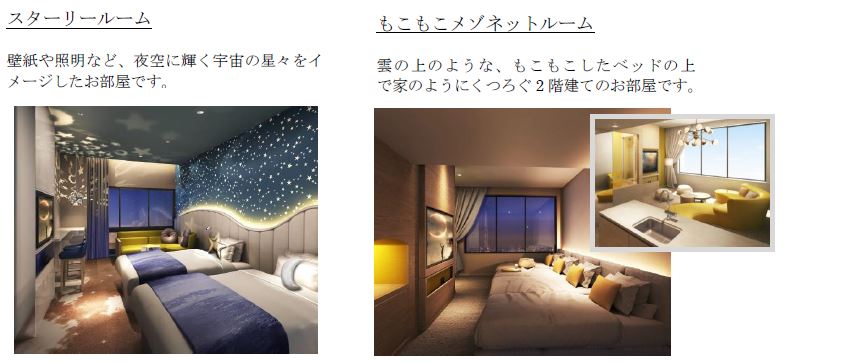 全428室の客室は「もこもこメゾネット」や「レインボールーム」など全14種類で構成されており、ゲストの滞在目的や家族構成に合わせたタイプが用意されます。