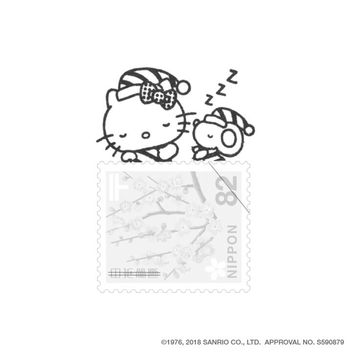 切手をお布団に見立てて、お友達のねずみのジョーイと一緒にすやすや眠るキティが可愛い!