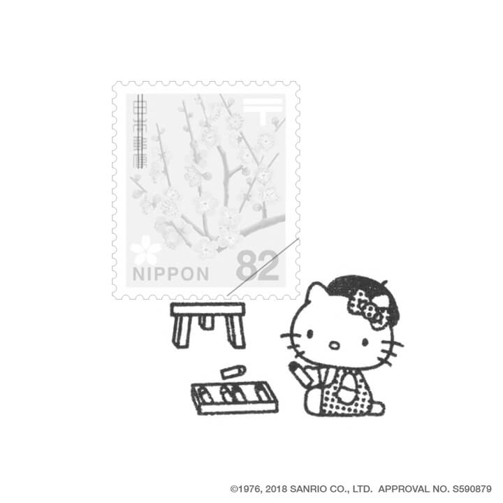 切手をキャンバスに見立てて、ベレー帽をかぶったキティがお絵かきしているようにアレンジできます。