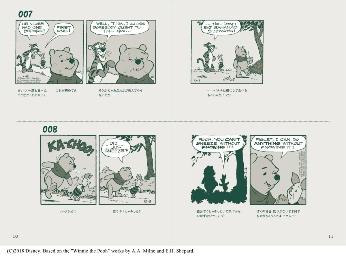 吹き出しの英語と、枠外に並記された日本語で、プーさんや仲間のピグレット、ティガーたちの言葉からやさしく英語を学べるのも素敵ですね。