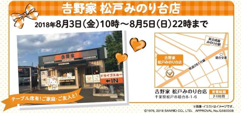 吉野家 恵比寿駅前店は2018年7月27日から7月29日までの3日間、吉野家 松戸みのり台店は2018年8月3日から8月5日までの3日間の開催です。