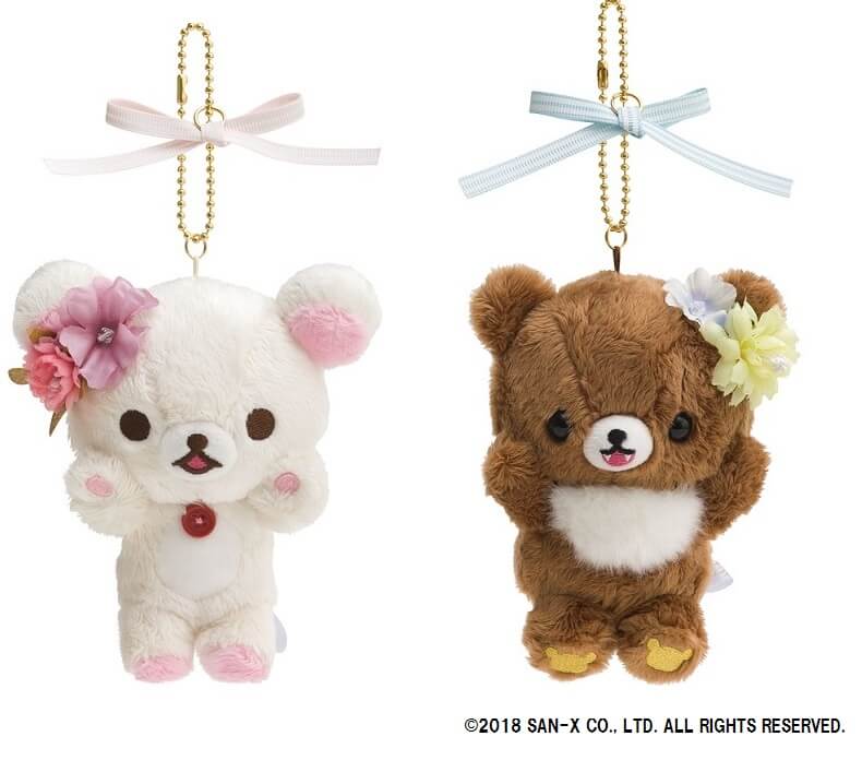 可愛い花の耳飾りをつけた、コリラックマとチャイロイコグマのキーホルダー。