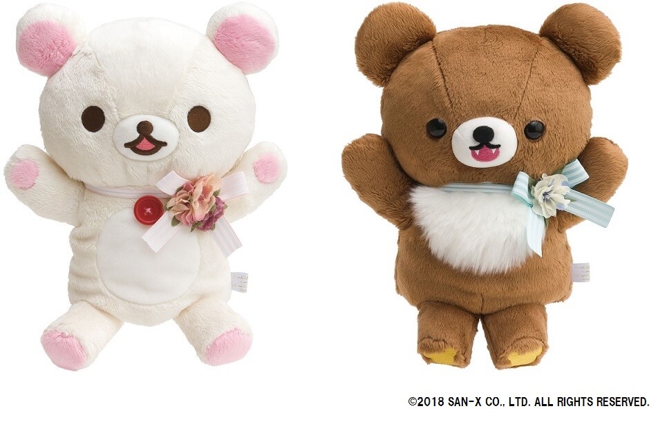 胸に花飾りをつけた、コリラックマとチャイロイコグマのパペット。
